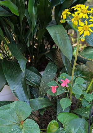 Wonder-Filled, a small, mostly shade garden, is a garden of whimsy, of memories of friends and family and of small wonders waiting to be found. This garden is jam-packed with plants - the usual and the unusual - and “yard art”. Shade-loving plants provide blooms or beautiful foliage year-round: multiple varieties of the old faithful cast iron plant (Aspidistra), a collection of tractor seat plants (Farfugium), the tried-and-true wandering jew (Tradescantia) and gingers. A few hours of sun in the front yard provide basil, bell peppers, cucumbers, and oranges. The wonder happens with an eye on recycle, reuse, and budget.